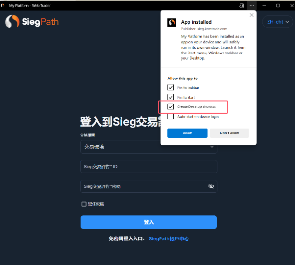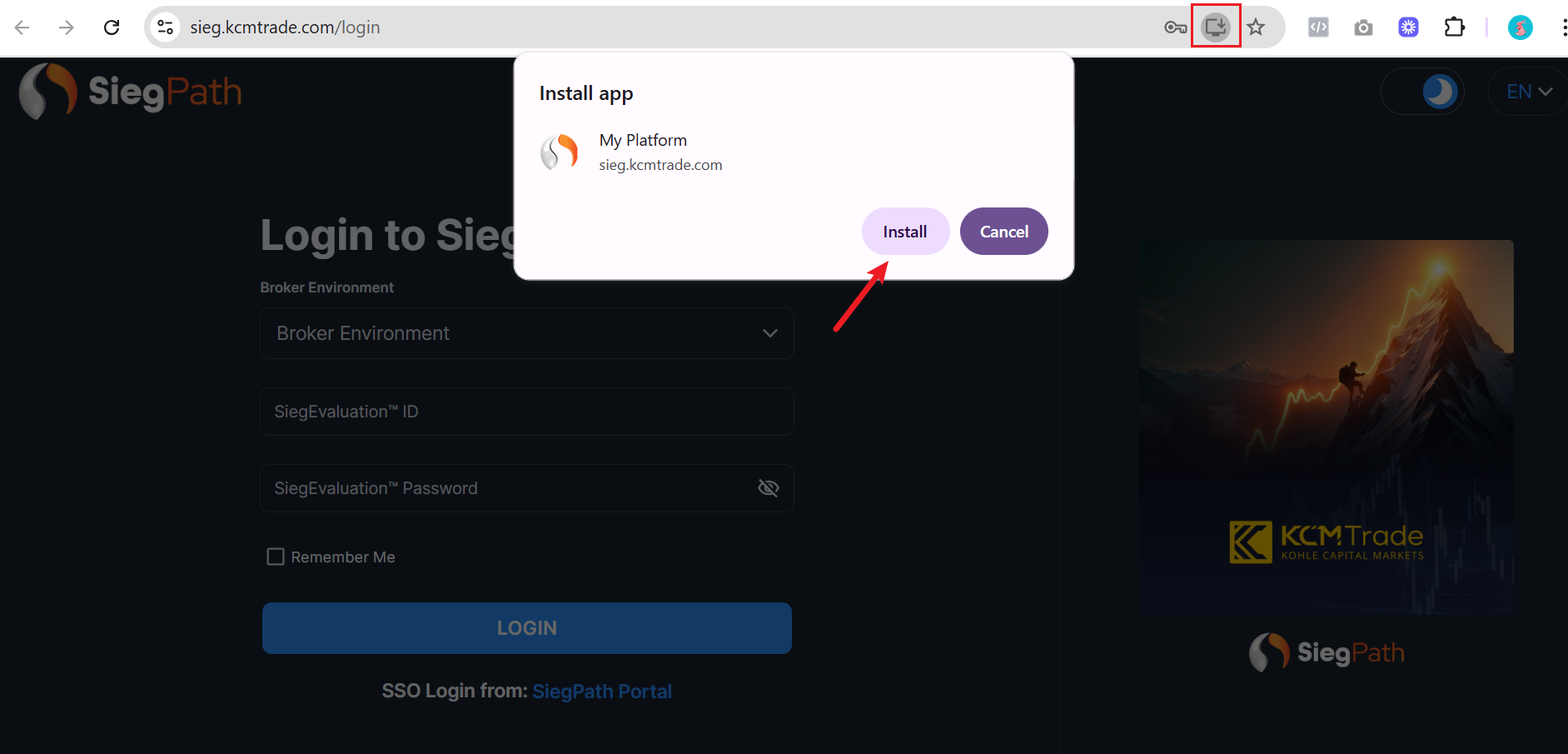 ユーザーダッシュボードにログインし、「Start Evaluation」ボタンをクリックしてSieg Terminalに入ります。または、ブラウザで「https://sieg.kcmtrade.com/login」と入力して直接ページに移動することもできます。ページで「インストール」アイコンをクリックすると、確認ウィンドウが表示されます。