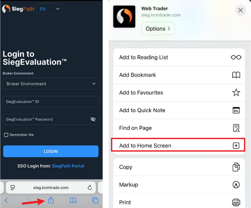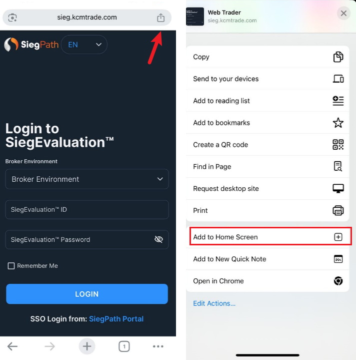 ユーザーダッシュボードにログインし、"評価開始 "ボタンをクリックしてSiegターミナルに入ります。または、Safariウェブブラウザを開き、https://sieg.kcmtrade.com/login、メニューバーの "共有 "ボタンをタップし、下にスクロールして "ホーム画面に追加 "を選択します。