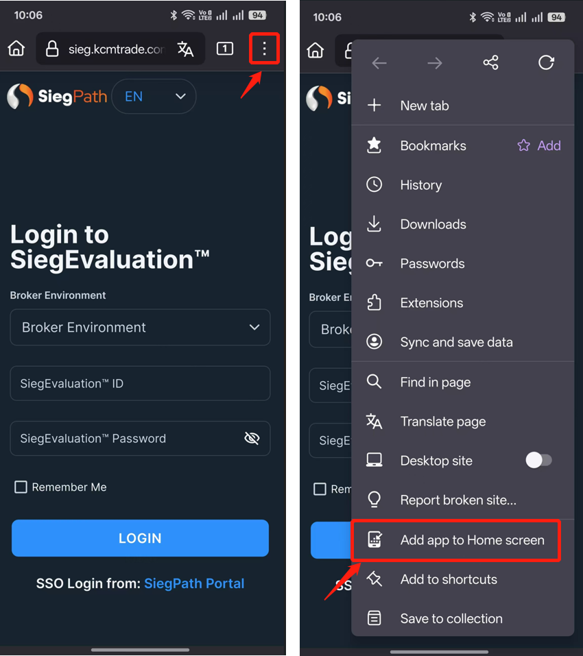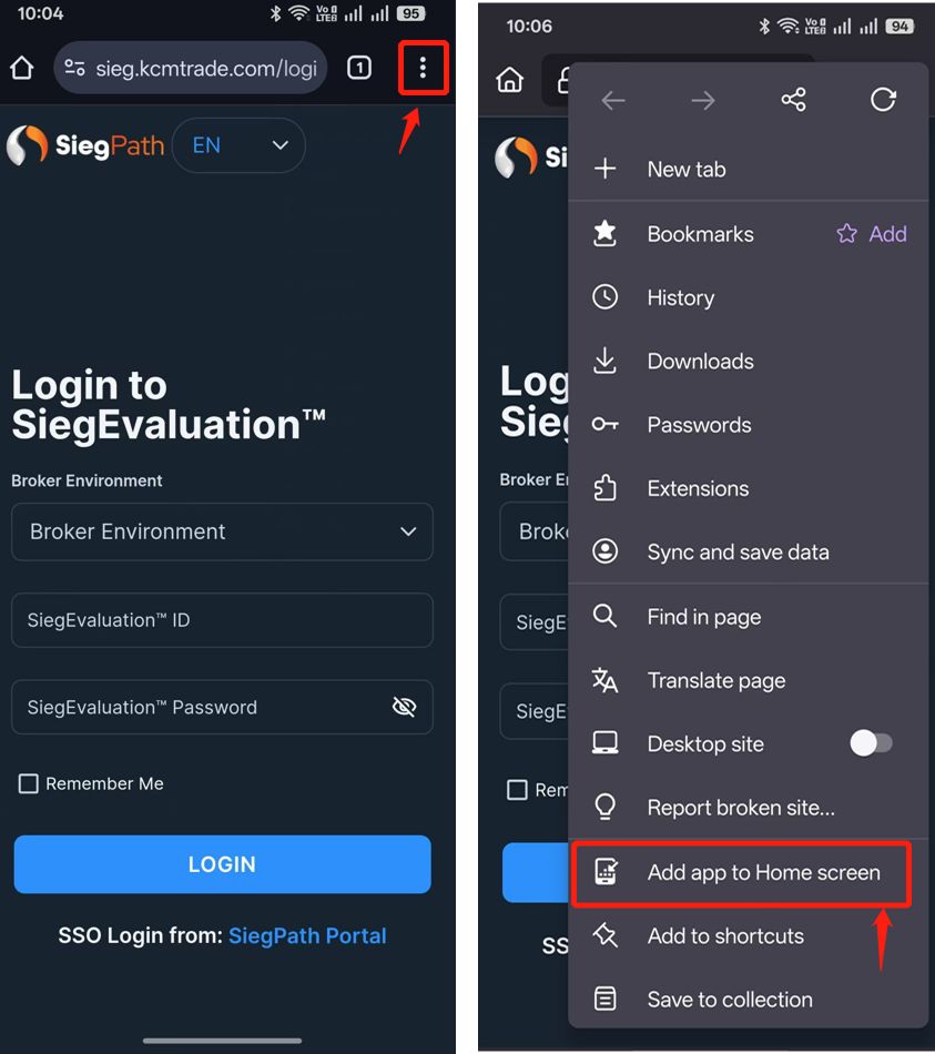 1.Google Chrome:ウェブブラウザを開き、Sieg TerminalのURLを入力します。https://sieg.kcmtrade.com/login右上のドロップダウンメニュー「"」アイコンをタップし、"ホーム画面にアプリを追加 "を選択します。