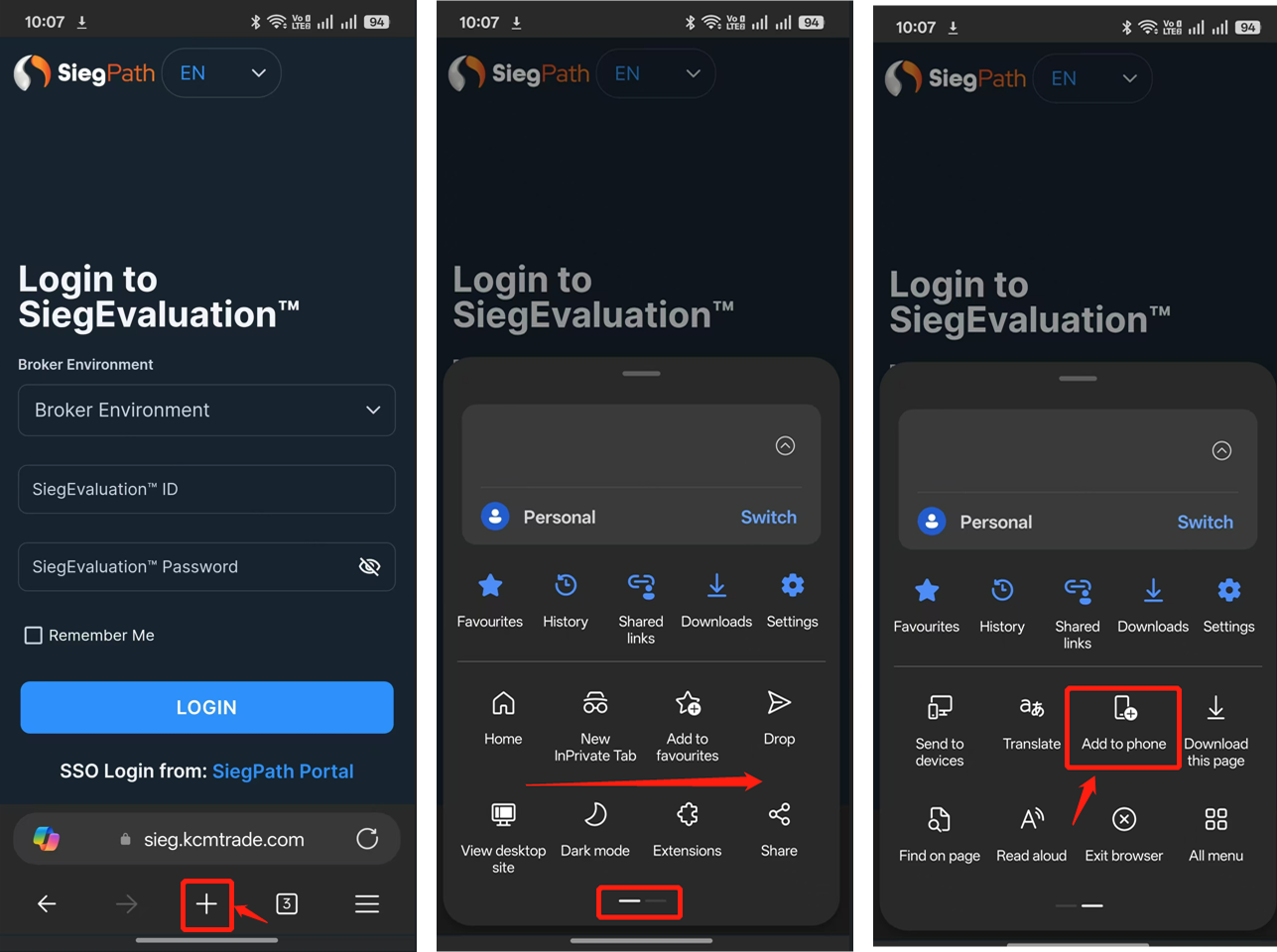2.Microsoft Edge:ウェブブラウザを開き、Sieg Terminal の URL を入力します。https://sieg.kcmtrade.com/login下部の "+" アイコンをタップしてブラウザメニューを開き、メニューの 2 ページ目までスワイプして "Add to phone" を選択します。